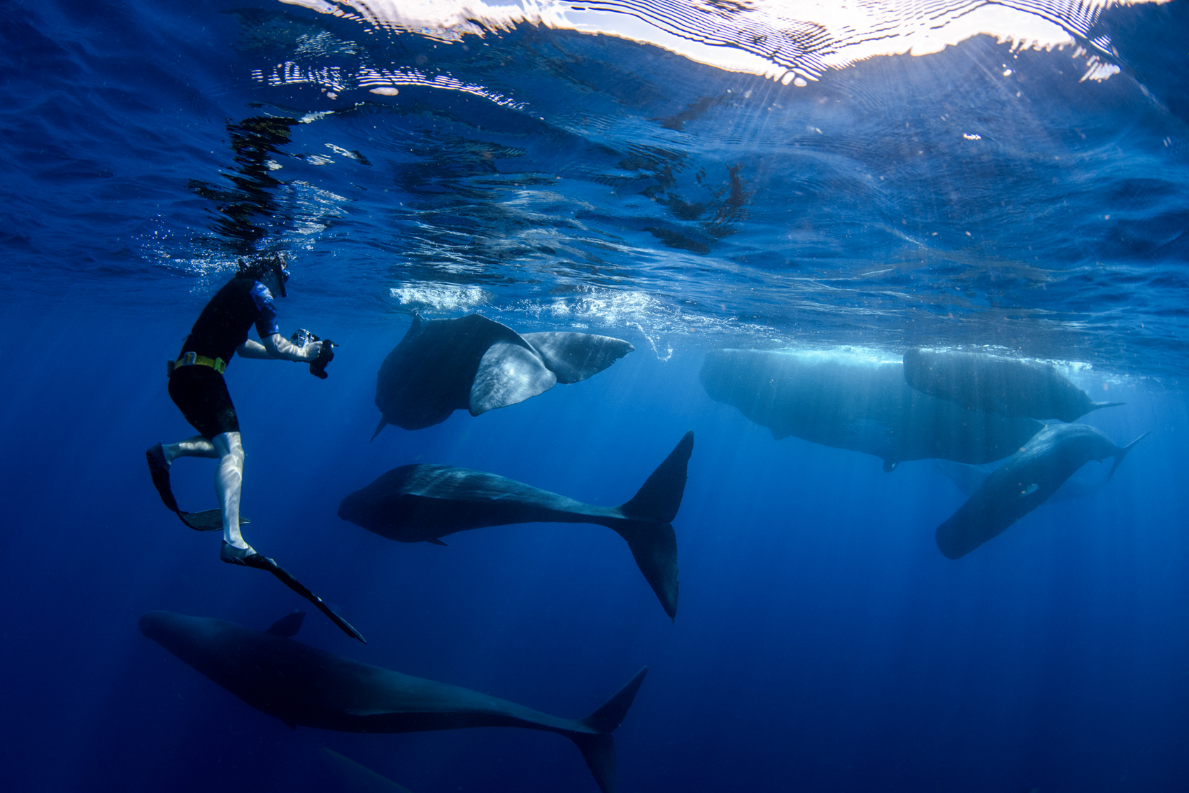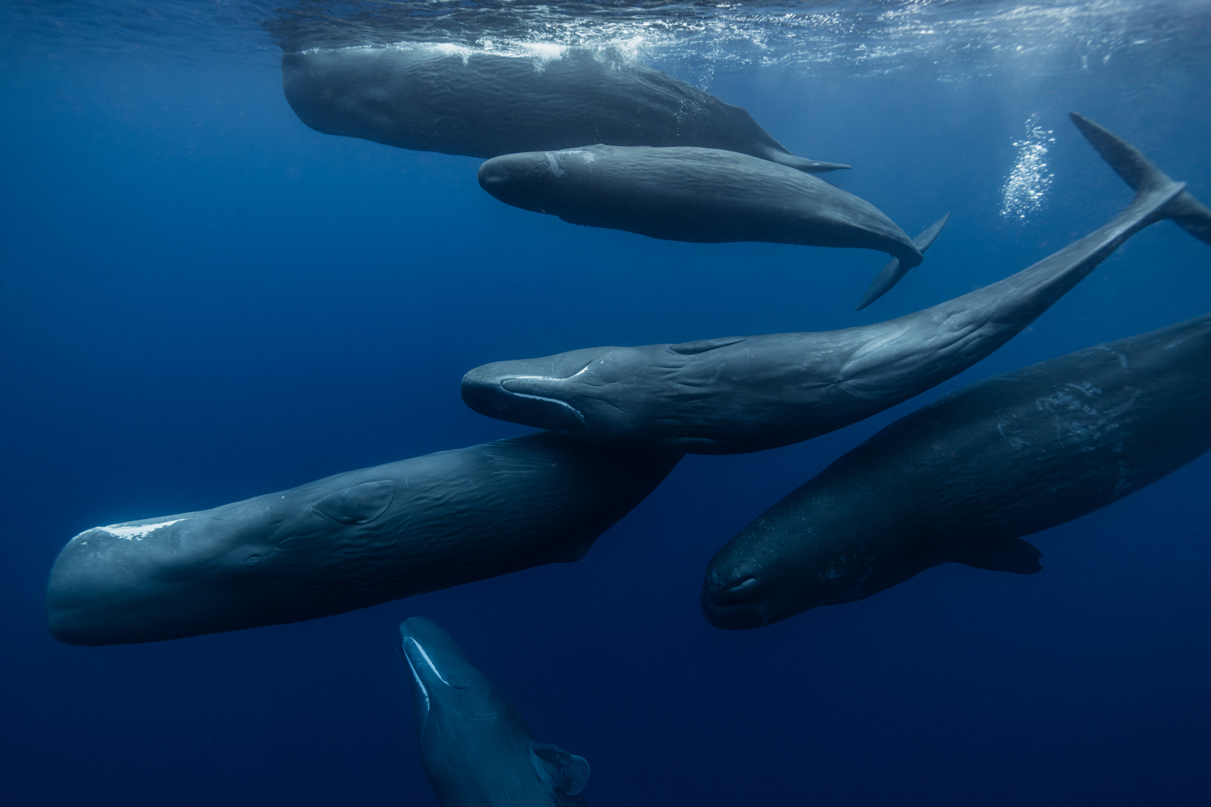 After emerging from the depths following their hunt, sperm whales may take a pause from their linear movement at the surface to socialize.